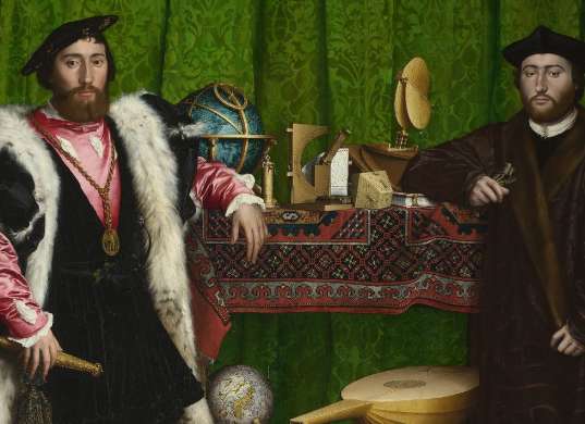汉斯·荷尔拜因是文艺复兴时期绘画的著名代表人物,他一生致力于肖像创作,并富有独创性。在《大使们》一画中,他着力表现出人物的社会地位、性格特征和心理状态,并吸收了意大利式的肖像技法。显然,画家并未矫揉造作地去故意美化、粉饰他们,而是以直观的、高度写实的手法忠实地记录了自己的感受和理解。但是,贵族习气的呆板和矜持也给作品带来了僵化的痕迹,这与迎合当时宫庭趣味的"矫饰主义风格"有关。