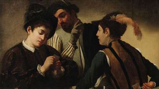 1594年1月,卡拉瓦乔决心走自己的路,他离开了切萨里。他的人生到了最低潮,但也就在这个时候他与几个人结下了非常重要的友谊,分别是画家普罗斯佩罗·奥尔西、建筑师奥诺里奥·隆吉和16岁的西西里岛艺术家马里奥·明尼蒂。已经在画坛确立地位的奥尔西把卡拉瓦乔介绍给有影响力的收藏家;隆吉更是要命地把他带入了罗马街头的争斗世界;明尼蒂则变成他最经常的模特及伴侣。《算命者》是首幅超过一个人物的画作,画得是马里奥正在被一个吉普赛女郎欺骗。这个主题在罗马来说非常新颖,在之后超过一个世纪的时间里产生了巨大的影响。不过,那时候卡拉瓦乔售出它几乎没挣到钱。《纸牌作弊老手》——表现另一个不懂世故的男孩落入纸牌骗子的圈套——心理上更复杂,也许是卡拉瓦乔的第一件真正的杰作。像《算命者》一样,《纸牌作弊老手》非常受人欢迎,现存有超过50个副本。更重要的是,它吸引了红衣主教弗朗切斯科·马里亚·德尔·蒙特的光顾。弗朗切斯科·马里亚·德尔·蒙特是罗马城里重要的鉴赏家,自此以后,卡拉瓦乔能够和明尼蒂共享红衣主教玛德玛宫里的一个房间。