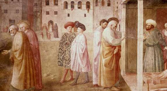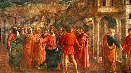 《新约》故事说:耶稣带门徒布道,路经一个关卡,收税人上前拦住他们的去路,要收他们的丁税,耶稣问彼得“你说我是谁?”彼得答“你是基督”(即上帝的儿子),耶稣说既然是上帝的儿子就不能交丁税,但不交税是不能过关的,于是吩咐彼得到池塘里去捕鱼,说鱼口里有一块银币可作税钱,于是彼得入塘捕鱼得银交于收税人。这副画上以连环的形式描绘了三个情节:阻拦、捉鱼及交付丁税。 这个宗教故事完全被画家描绘成真实的世俗场面,画中人都是画家同时代的普通百姓,他们按自己身份和所处的地位,被恰当地安置在真实的自然环境中,符合空间透视法则,具有深远感,人物被塑造得庄严而厚重,结构明确而清晰。瓦萨利说:“马萨乔使他的画中的人物脚踏实地、稳固地站立在土地上。”马萨乔首先注意到光对于表现物体的作用,使画中物象充满了光线与空气;而通过光与空气的描绘,使画面上的人物与环境产生距离的感觉。马萨乔的艺术探索,为现实主义艺术创作奠定了基础。